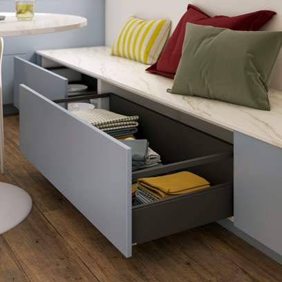Los cajones que hay debajo del banco hecho a medida se abren por presión y ofrecen espacio extra de almacenamiento. ¡Si no te lo llegamos a contar, no te habrías fijado!